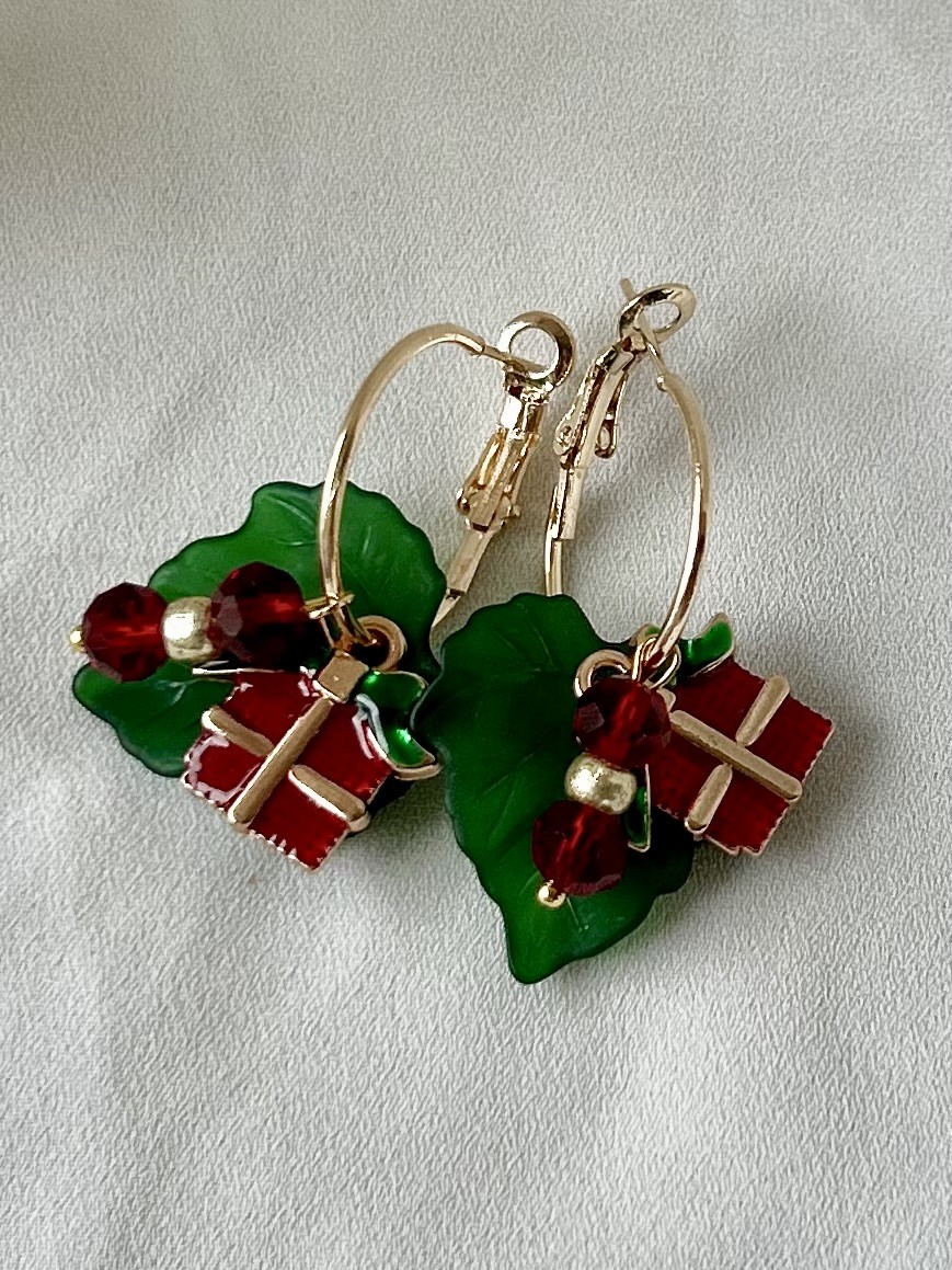 Kauniita jouluiset korvakorut. Kullanvärinen nikkeelitön rengas jossa vihreä lehti, emaloitu joululahja sekä korukiviä.