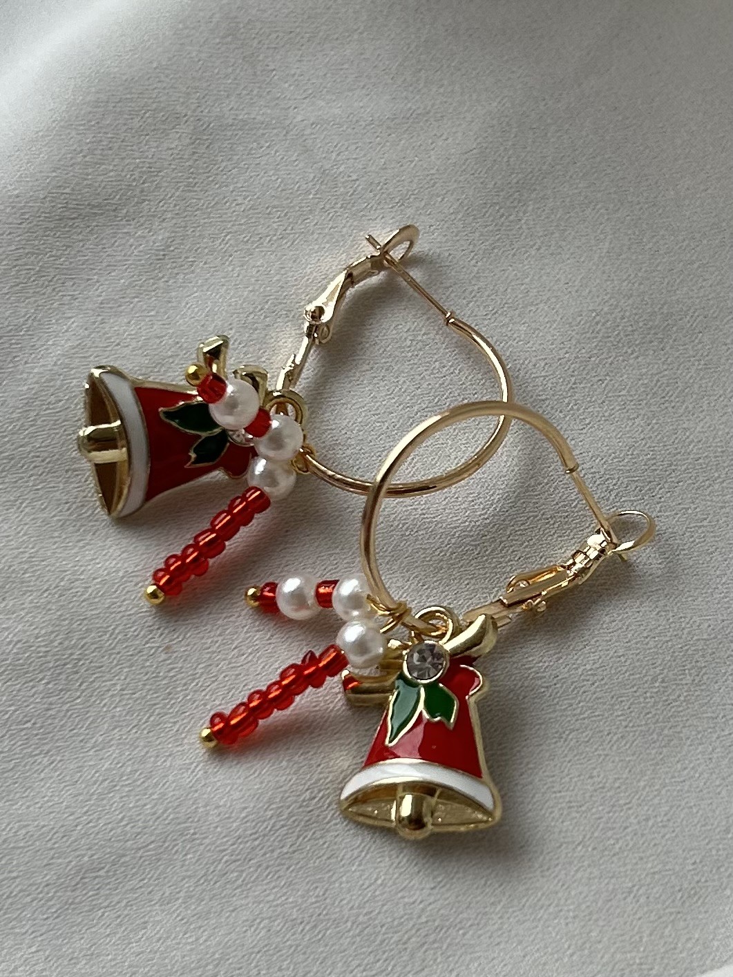 Kauniit jouluiset korvakout. Kullattu nikkelitön rengas jossa joulukello sekä koristeena kaksi pientä helmikeppiä. Renkaan nikkelittömät.
