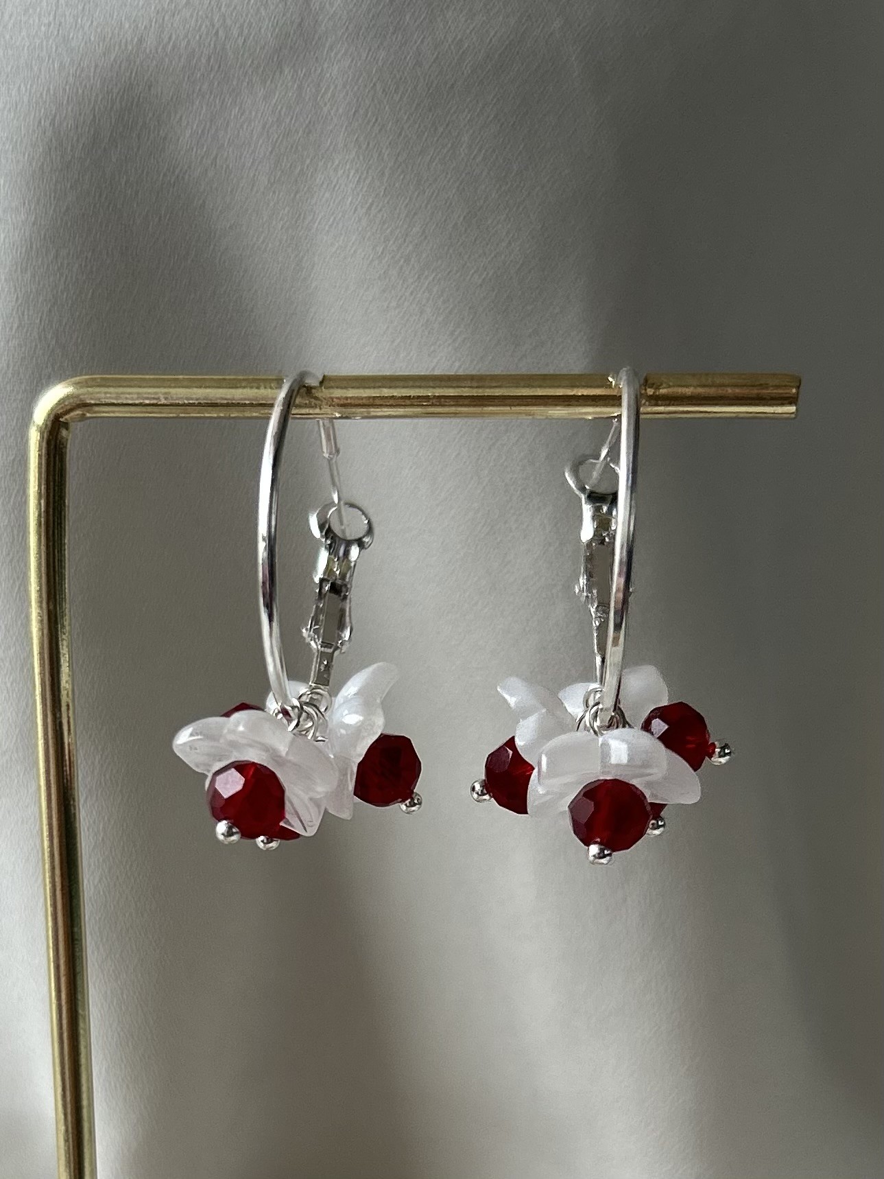 Upeat hopeanväriset korvakorut jossa valkoisia lasikukkia ja tummanpunaisia lasihelmiä. Rengas on nikkelitön ja halk 3 cm.