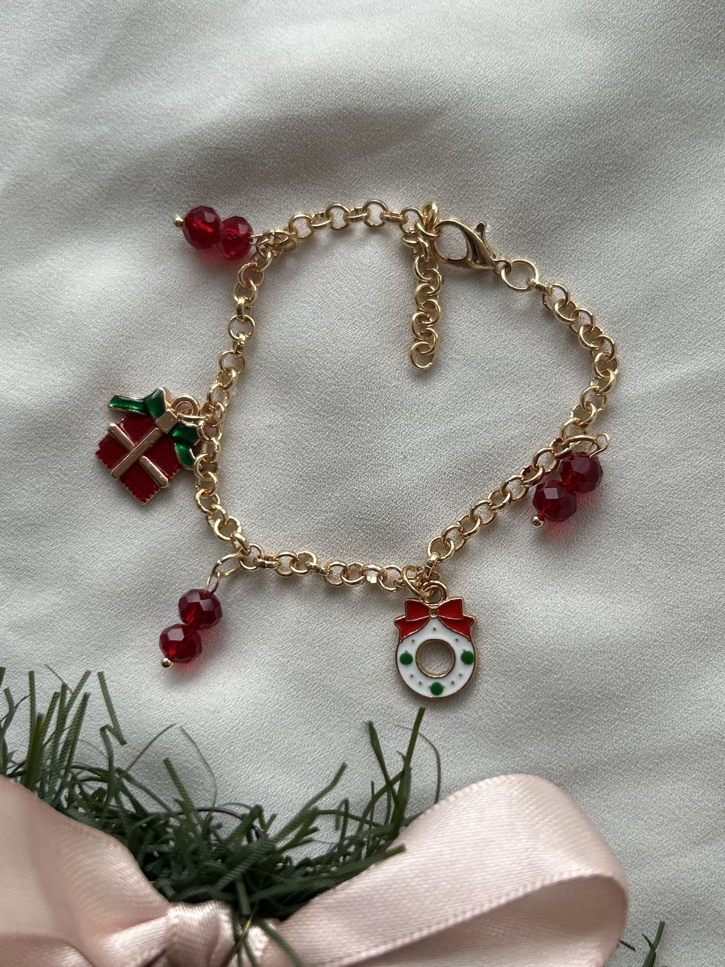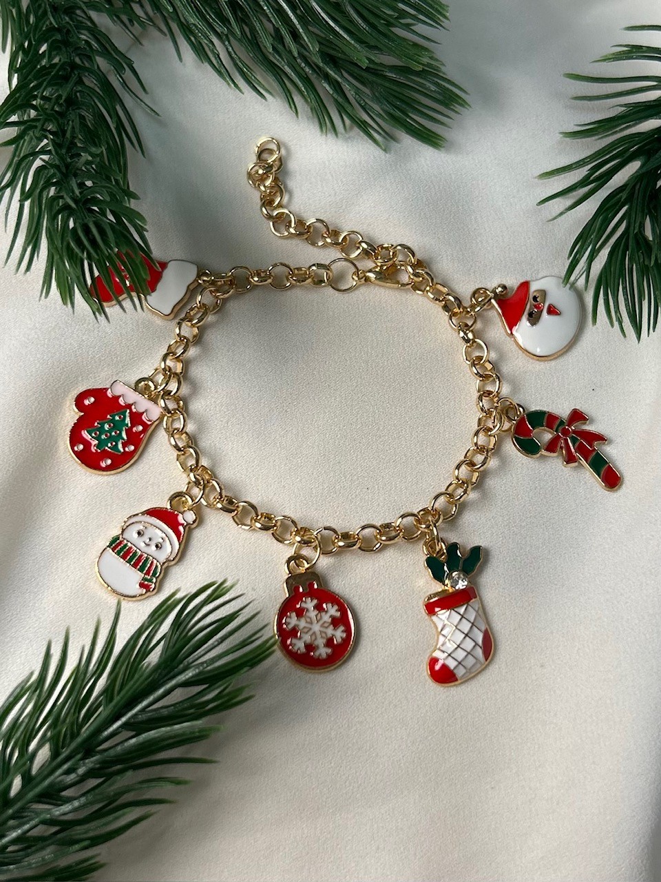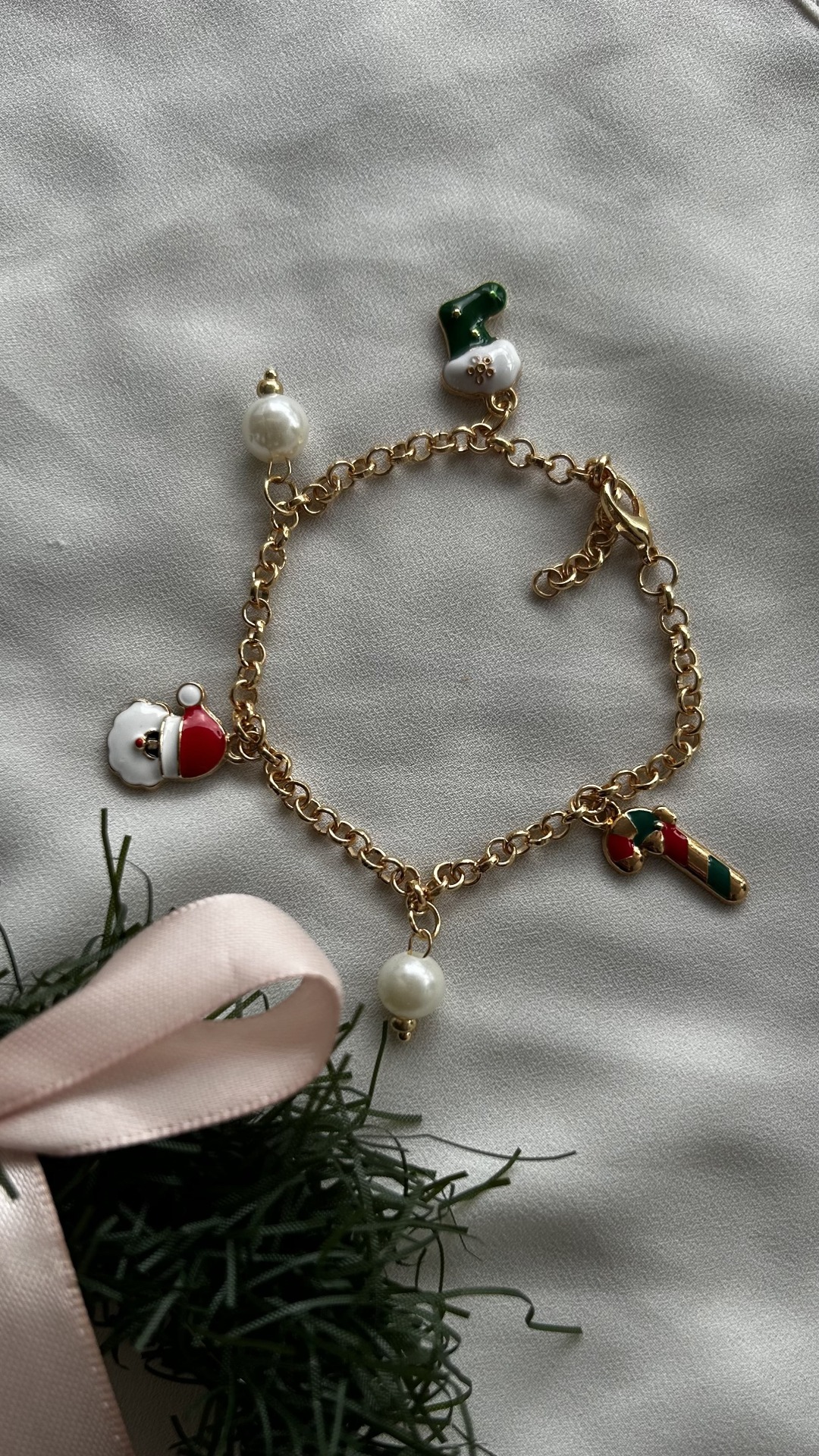 Kaunis rannekoru jossa viisi jouluista riipusta. Ketjun sävy on vaaleankultainen mutta taittaa hieman ruusukultaan. Ketju on nikkelitön.