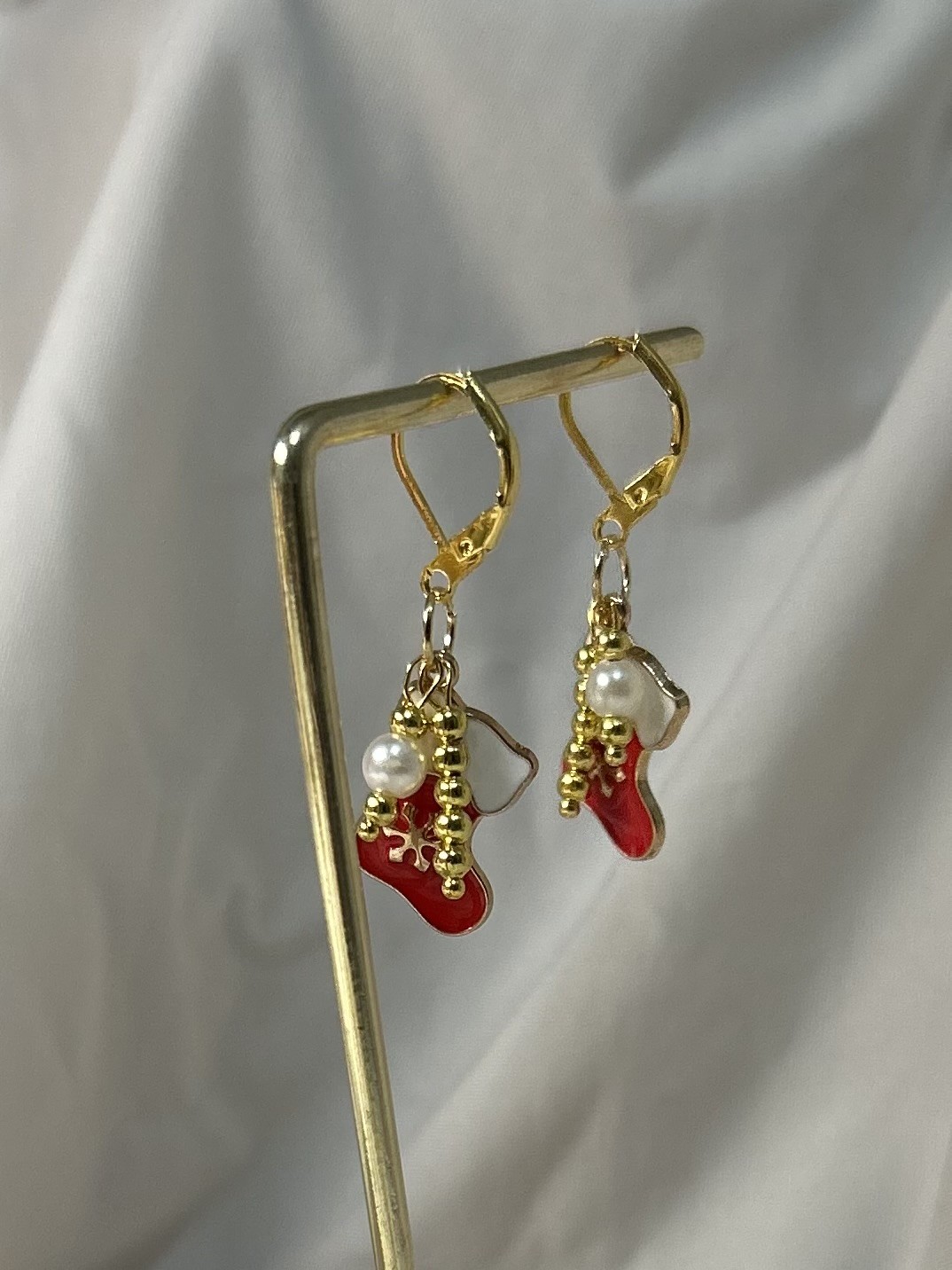 Kullatut korvakorut jossa emaloitu jooulusukka sekä kaksi kullanväristä/helmiriipusta. Nikkelittömät