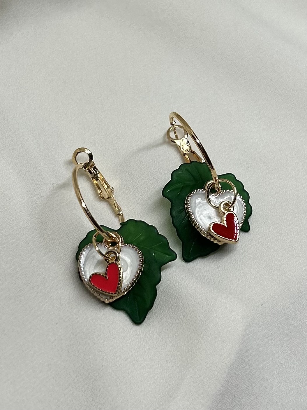 Kullattu korvarengas joka on nikkelitön ja ruostumaton. Riipuksina vihreä lehti sekä valkoinen ja puninen emalinen sydän.